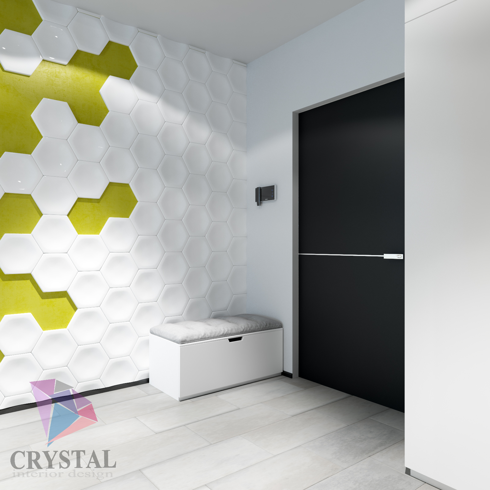 Давайте же посмотрим, что у нас получилось. При входе в квартиру, стоит обратить внимание на зеркальную стену, где скрывается дверь в ванную комнату. Она выполнена с помощью технологии скрытого монтажа, поэтому с первого взгляда и не понять, что там есть дверь. Также изюминкой коридора являются 3D панели с яркой контрастной горчичной краской на стене.